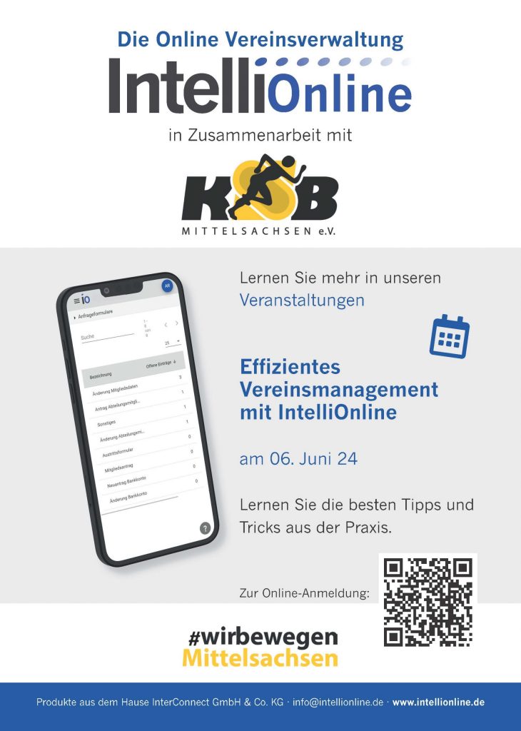 Der Kreissportbund Mittelsachsen präsentiert im Juni zwei spannende Online-Fortbildungsangebote: “Wir coachen Coaches” mit SPOMIND Kostenfreier Informationsabend: IntelliOnline Anmeldungen jeweils Nutzt die Gelegenheit zur Weiterbildung und Vernetzung. Wir freuen uns auf Eure Teilnahme!