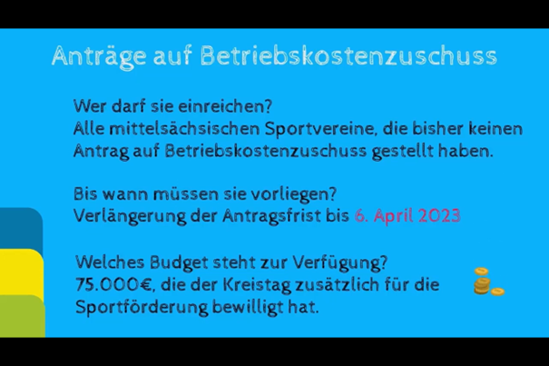 Bis zum 6. April 2023 können die Anträge auf Betriebskostenzuschuss beim Landratsamt Mittelsachsen erneut eingereicht werden. „Der Aufruf gilt für Sportvereine, die bisher keinen Antrag auf Betriebskostenzuschuss gestellt haben“, so Markus Unverricht, Leiter des Referats Straßenverkehr und Sport. In Absprache mit dem Kreissportbund Mittelsachsen e.V. soll dabei unter anderem der finanzielle Bedarf durch gestiegene Energiekosten der Sportvereine […]